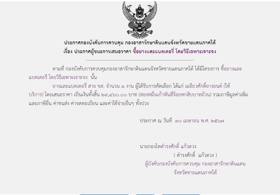 จัดซื้อ จัดจ้างประกาศผู้ชนะการเสนอราคา ประกาศผู้ชนะการเสนอราคา ซื้อยางและแบตเตอรี่ โดยวิธีเฉพาะเจาะจง May 2, 2024 302 Share Facebook Twitter Google+ Telegram LINE