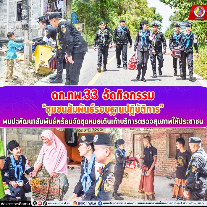 เมื่อวันที่ 4 พฤษภาคม 2567 หน่วยเฉพาะกิจกรมทหารพรานที่ 33 จัดกำลังพล ชุดปฏิบัติการกิจการพลเรือน หมวดทหารพรานหญิง 32 ร่วมกับ ชุดปฏิบัติการกิจการพลเรือน กองร้อยทหารพรานที่ 3309 จัดกิจกรรม “ชุมชนสัมพันธ์รอบฐานปฏิบัติการ” โดยเข้าพบปะพัฒนาสัมพันธ์กับประชาชนในพื้นที่ และจัดชุดหมอเดินเท้า ให้บริการตรวจสุขภาพผู้สูงอายุ และประชาชนถึงบ้าน ในชุมชนรอบฐานปฏิบัติการ พร้อมทั้งแจกจ่ายยาเวชภัณฑ์ และแนะนำวิธีการดูแลสุขภาพให้กับประชาชน เพื่อเป็นการบรรเทาความเดือดร้อน ลดค่าใช้จ่าย และลดภาระในการเดินทางไปพบแพทย์ อีกทั้งยังเป็นการให้กำลังใจ สร้างความอบอุ่นใจให้แก่ประชาชน และสร้างความสัมพันธ์อันดีระหว่างเจ้าหน้าที่ และประชาชนในพื้นที่รอบฐานปฏิบัติการ หน่วยเฉพาะกิจกรมทหารพรานที่ 33 บ้านยีลาปัน หมู่ที่ 11 ตำบลตลิ่งชัน อำเภอบันนังสตา จังหวัดยะลา