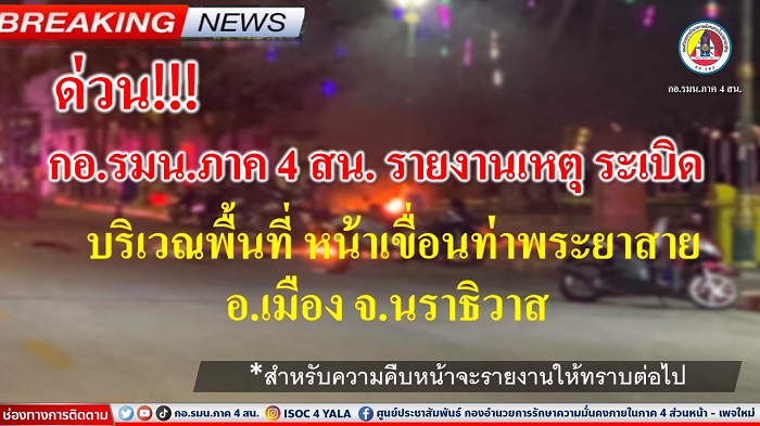 วันนี้ (วันที่ 6 พฤษภาคม 2567) เวลาประมาณ 21.35 น. เกิดเหตุคนร้ายไม่ทราบจำนวน วางระเบิดแสวงเครื่องโดยติดตั้งในรถจักรยานยนต์และจอดไว้บริเวณหน้าเขื่อนท่าพระยาสาย ถนนภูผาภักดี ตำบลบางนาค อำเภอเมือง จังหวัดนราธิวาส เป็นเหตุให้มีผู้ได้รับบาดเจ็บ จำนวน 4 ราย ดังนี้