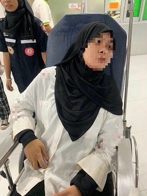 - นางสาว ซาฮีระห์ กาจิ มีบาดแผลบริเวณใบหน้ายาวประมาณ 2 เซนติเมตร