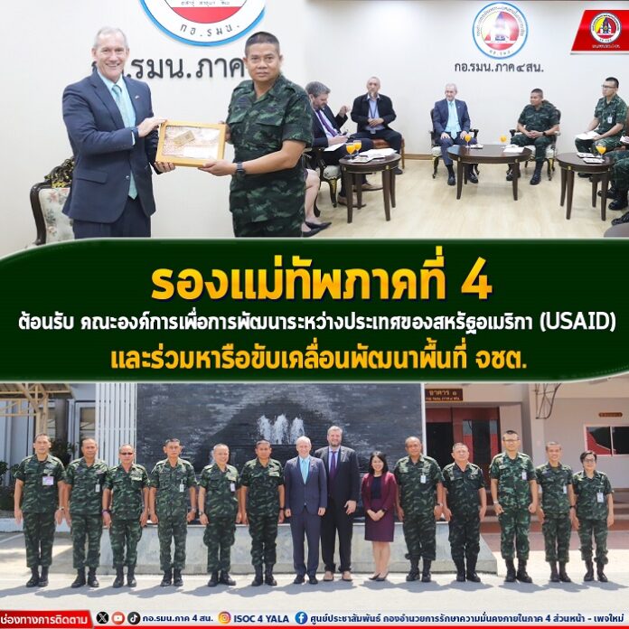 วันนี้ 8 พฤษภาคม 2567 เวลา 10.00 น. ที่ ห้องรับรอง กองอำนวยการรักษาความมั่นคงภายในภาค 4 ส่วนหน้า ค่ายสิรินธร ตำบลเขาตูม อำเภอยะรัง จังหวัดปัตตานี พลตรี ไพศาล หนูสังข์ รองแม่ทัพภาคที่ 4/ รองผู้อำนวยการรักษาความมั่นคงภายในภาค 4 ส่วนหน้า และคณะฯ ให้การต้อนรับ ดร.สตีเว่น จี. โอลีฟ ผู้อำนวยการองค์การเพื่อการพัฒนาระหว่างประเทศของสหรัฐอเมริกา (USAID) สำนักงานภาคพื้นเอเชีย และคณะฯ ในโอกาสเดินทางมาเยือนในพื้นที่จังหวัดชายแดนภาคใต้ ระหว่างวันที่ 6-9 พฤษภาคม 2567 โดยการเยือนกองอำนวยการรักษาความมั่นคงภายในภาค 4 ส่วนหน้าในครั้งนี้ เพื่อรายงานความคืบหน้าเกี่ยวกับโครงการ Enhance ซึ่งเป็นโครงการขององค์การเพื่อการพัฒนาระหว่างประเทศของสหรัฐอเมริกา (USAID) เข้ามาทำงานร่วมกับองค์กรปกครองส่วนท้องถิ่น (อปท.) ในพื้นที่จังหวัดชายแดนภาคใต้ เพื่อเสริมสร้างศักยภาพให้กับ อปท. สามารถนำนวัตกรรมที่สามารถดึงประชาชน เข้ามามีส่วนร่วมในการจัดการปกครองท้องถิ่นให้มีศักยภาพมากยิ่งขึ้น