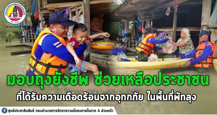 เมื่อวันที่ 3 ธันวาคม 2563 ณ กองบังคับการกองทัพไทย (หน่วยบัญชาการทหารพัฒนา) โดย ศูนย์บรรเทาสาธารณภัย สำนักงานพัฒนาภาค 4 หน่วยบัญชาการทหารพัฒนา จัดกำลังพลชุดบรรเทาสาธารณภัยเคลื่อนที่เร็ว จำนวน 12 นาย ร่วมกับประชาชนผู้มีจิตศรัทธานำถุงยังชีพ ประกอบด้วย ข้าวสาร อาหารแห้ง ยาสามัญประจำบ้าน จำนวน 300 ถุง และน้ำดื่ม 2,000 ขวด ไปแจกจ่ายให้ความช่วยเหลือประชาชนที่ได้รับความเดือดร้อนจากอุทกภัย ในพื้นที่ของ อำเภอบางแก้ว และ อำเภอเขาชัยสน จังหวัดพัทลุง ซึ่งปัจจุบันฝนยังคงตกต่อเนื่อง ทางหน่วยเฝ้าติดตามสถานการณ์โดยประสานกับส่วนราชการในพื้นที่อย่างใกล้ชิด