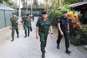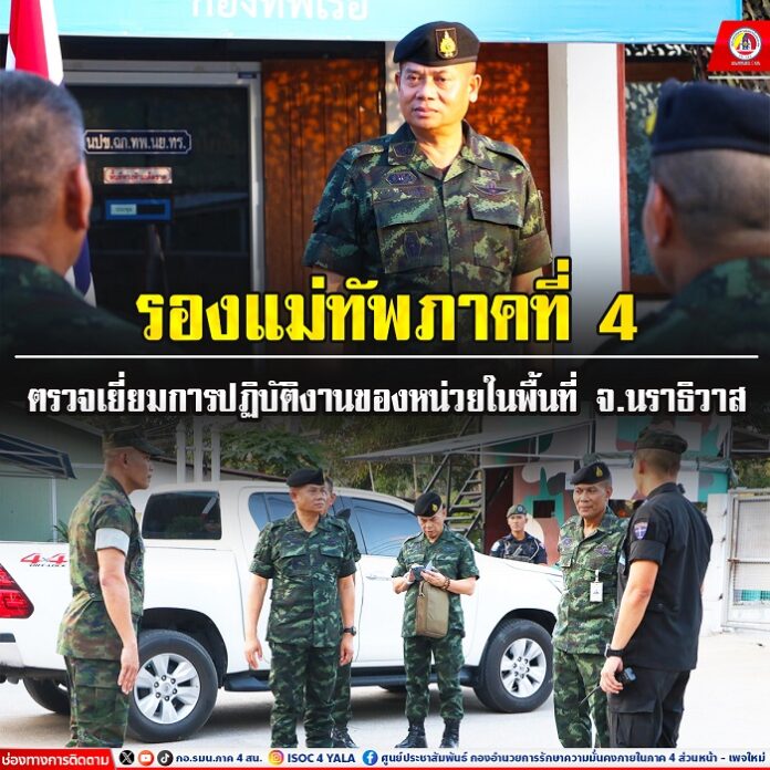 เมื่อวันที่ 8 พฤษภาคม 2567 เวลา 13.00 น. พลตรี ไพศาล หนูสังข์ รองแม่ทัพภาคที่ 4 / รองผู้อำนวยการรักษาความมั่นคงภายในภาค 4 ส่วนหน้า พร้อมคณะฯ ลงพื้นที่ตรวจเยี่ยมการปฏิบัติงานของหน่วยในพื้นที่จังหวัดนราธิวาส ประกอบด้วย หน่วยเฉพาะกิจนาวิกโยธินกองทัพเรือที่ 33 ตำบลปาเสมัส อำเภอสุไหงโก-ลก และหน่วยเฉพาะกิจกรมทหารพรานนาวิกโยธิน กองทัพเรือ ตำบลบาเจาะ อำเภอบาเจาะ จังหวัดนราธิวาส โดยมี ผู้บังคับหน่วยในพื้นที่ หัวหน้าส่วนที่เกี่ยวข้อง ร่วมให้การต้อนรับและสรุปผลการปฏิบัติงานในห้วงที่ผ่านมา