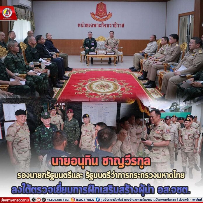 เมื่อวันที่ 10 พฤษภาคม 2567 เวลา 15.30 น. ณ ที่ว่าการอำเภอสุคิริน อำเภอสุคิริน จังหวัดนราธิวาส นายกองใหญ่อนุทิน ชาญวีรกูล รองนายกรัฐมนตรีและรัฐมนตรีว่าการกระทรวงมหาดไทย ในฐานะผู้บัญชาการกองอาสารักษาดินแดน พร้อมด้วย พลเอก เจริญชัย หินเธาว์ ผู้บัญชาการทหารบก และคณะ ลงพื้นที่ตรวจเยี่ยม การฝึกเสริมสร้างผู้นำสมาชิกกองอาสารักษาดินแดนจังหวัดชายแดนภาคใต้ พ.ศ. 2567 ระหว่างวันที่ 1 – 10 พฤษภาคม 2567 โดยได้ติดตามสรุปผลการปฎิบัติงาน ตลอดจนรับทราบปัญหา ข้อขัดข้อง และข้อเสนอแนะ พร้อมพบปะให้กำลังใจเจ้าหน้าที่และส่วนราชการที่มาต้อนรับ บรรยากาศเป็นไปอย่างอบอุ่น โดยมี พลโท ศานติ ศกุนตนาค แม่ทัพภาคที่ 4 / ผู้อำนวยการรักษาความมั่นคงภายในภาค 4, พลโท ปราโมทย์ พรหมอินทร์ แม่ทัพน้อยที่ 4 / รองผู้อำนวยการรักษาความมั่นคงภายในภาค 4 ส่วนหน้า,พลตรี ไพศาล หนูสังข์ รองแม่ทัพภาคที่ 4/รองผู้อำนวยการรักษาความมั่นคงภายในภาค 4 ส่วนหน้า, หัวหน้าส่วนราชการและส่วนที่เกี่ยวข้องร่วมให้การต้อนรับ