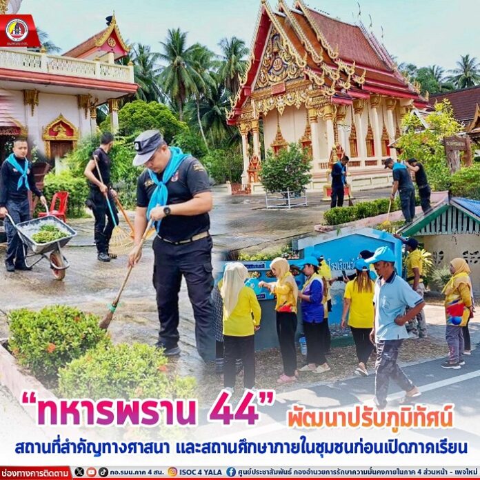 เมื่อวันที่ 11 พฤษภาคม 2567 กรมทหารพรานที่ 44/หน่วยเฉพาะกิจกรมทหารพรานที่ 44 จัดกำลังพลของหน่วยเข้าพัฒนาปรับปรุงภูมิทัศน์ภายในเขตพื้นที่ สถานที่สำคัญทางศาสนา ณ วัดสารวัน หมู่ที่ 2 บ้านสารวัน ตำบลไทรทอง อำเภอไม้แก่น จังหวัดปัตตานี เพื่อให้มีความเป็นระเบียบ เรียบร้อย สะอาด และน่ามอง ภายใต้ “สังคมพหุวัฒนธรรม การอยู่ร่วมกันอย่างสันติสุขภายในชุมชน” พร้อมกันนี้กำลังพลของหน่วยในส่วนของ จิตอาสาทหารพรานฯ ร่วมกับ บุคลากรทางการศึกษาในพื้นที่ เข้าร่วมกิจกรรม “จิตอาสาบำเพ็ญสาธารณประโยชน์” ในการช่วยกันพัฒนา (ทาสี) และปรับปรุงพื้นที่โดยรวมของสถานศึกษา ณ โรงเรียนวัดโบกขรณี ตำบลแป้น อำเภอสายบุรี จังหวัดปัตตานี ก่อนการเปิดภาคเรียน ในห้วงเดือน พฤษภาคม 2567 เพื่อให้สถานศึกษามีความเป็นระเบียบ เรียบร้อย สะอาด และสร้างบรรยากาศ สร้างสิ่งแวดล้อมที่เป็นมิตร และคุณภาพชีวิตที่ดีของคนในพื้นที่อีกด้วย