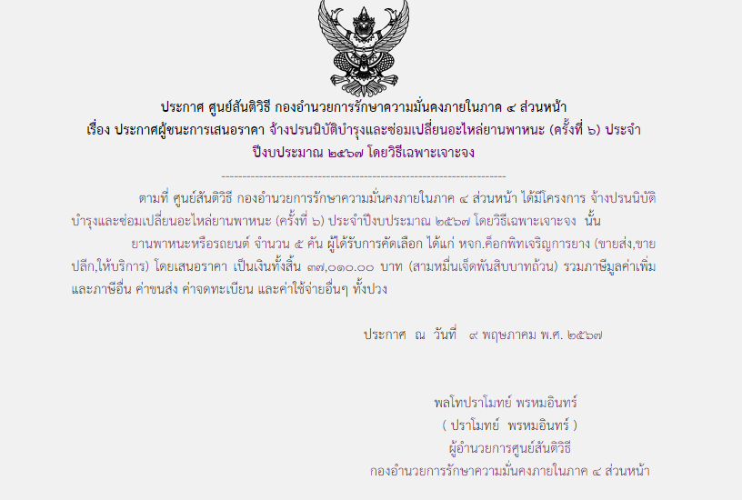จัดซื้อ จัดจ้างประกาศผู้ชนะการเสนอราคา ประกาศผู้ชนะการเสนอราคา จ้างปรนนิบัติบำรุงและซ่อมเปลี่ยนอะไหล่ยานพาหนะ (ครั้งที่ ๖) ประจำ ปีงบประมาณ ๒๕๖๗ โดยวิธีเฉพาะเจาะจง May 12, 2024 471 Share Facebook Twitter Google+ Telegram LINE