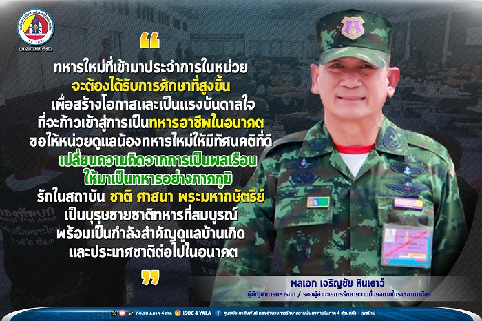 “ ทหารใหม่ที่เข้ามาประจำการในหน่วย จะต้องได้รับการศึกษาที่สูงขึ้น เพื่อสร้างโอกาสและเป็นแรงบันดาลใจที่จะก้าวเข้าสู่การเป็นทหารอาชีพในอนาคต ขอให้หน่วยดูแลน้องทหารใหม่ให้มีทัศนคติที่ดี เปลี่ยนความคิดจากการเป็นพลเรือน ให้มาเป็นทหารอย่างภาคภูมิ รักในสถาบัน ชาติ ศาสนา พระมหากษัตริย์ เป็นบุรุษชายชาติทหารที่สมบูรณ์ พร้อมเป็นกำลังสำคัญดูแลบ้านเกิด และประเทศชาติต่อไปในอนาคต ”