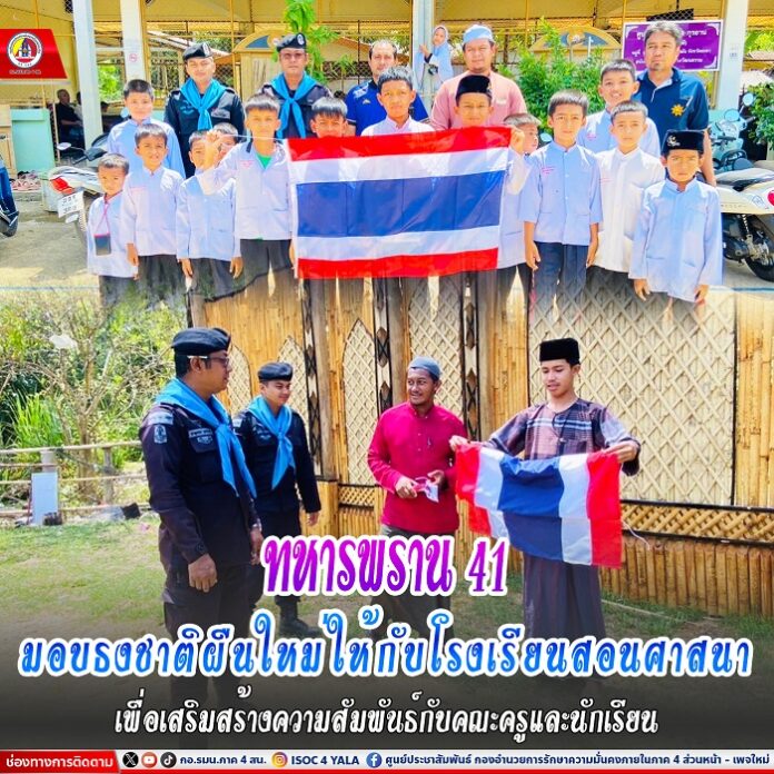 เมื่อวันที่ 11 พฤษภาคม 2567 เวลา 09.30 น. หน่วยเฉพาะกิจกรมทหารพรานที่ 41 จัดกำลังพล กองร้อยทหารพรานที่ 4115 ร่วมกับ นายอับดุลรอนิง สะมูฮำมะ ผู้ใหญ่บ้าน เข้าพบปะพัฒนาความสัมพันธ์กับคณะครูและนักเรียนโรงเรียนสอนศาสนา ในพื้นที่หมู่ที่ 5 บ้านสะโต ตำบลอาซ่อง อำเภอรามัน จังหวัดยะลา พร้อมทั้งมอบธงชาติผืนใหม่ให้กับโรงเรียน โดยเปลี่ยนธงชาติผืนเก่าที่มีสีซีด ให้เป็นธงชาติผืนใหม่ที่มีสีสดใส เพื่อปลูกฝังอุดมการณ์ความรักชาติ ศาสนา และสถาบันพระมหากษัตริย์ และเสริมสร้างความรัก ความสามัคคีระหว่างประชาชนกับเจ้าหน้าที่รัฐ