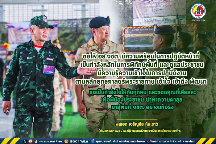 “ขอให้สมาชิกกองอาสารักษาดินแดนจังหวัดชายแดนภาคใต้ มีความพร้อมในการปฏิบัติหน้าที่ เป็นกำลังหลักในการพิทักษ์พื้นที่ และดูแลประชาชน มีความรู้ความเข้าใจในการปฏิบัติงาน ตามหลักยุทธศาสตร์พระราชทาน เข้าใจ เข้าถึง พัฒนา ขอเป็นกำลังใจให้กับทุกคน และขอบคุณที่เสียสละเพื่อพี่น้องประชาชน และนำพาความผาสุขมาสู่พื้นที่จังหวัดชายแดนภาคใต้อย่างแท้จริง”