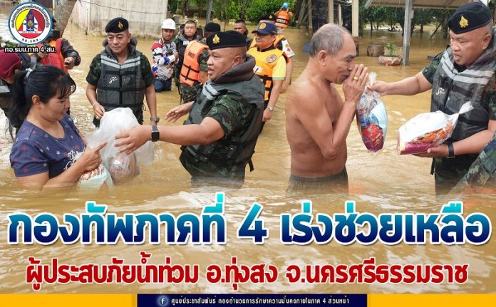 โดยแม่ทัพภาคที่ 4 และผู้บัญชาการกองพลทหารราบที่ 5 ได้ลงพื้นที่ยัง เทศบาล ต.ที่วัง ม.1 บ้านชายคลอง และหมู่ที่ 6 บ้านนาเปลี่ยน ซึ่งเป็นบริเวณที่มีน้ำท่วมสูงชาวบ้านได้รับความเดือดร้อน รวมไปถึงบริเวณตลาดนัดวังแก้วที่น้ำมีปริมาณที่สูง และเชี่ยวกราด ถนนถูกตัดขาดกว่า 2 กม. โดยได้นำถุงยังชีพอาหารเครื่องดื่มมามอบให้เพื่อบรรเทาความเดือดร้อนในเบื้องต้น เนื่องจากการเข้าออกมีความยากลำบาก ต้องใช้กำลังพลและเรือยางเข้าให้ความช่วยเหลือ รถไม่สามารถสัญจรไปมาได้ ในภาพรวมสถานการณ์น้ำในทุ่งสงจะมีการระบายได้โดยเร็ว แต่น้ำที่มีปริมาณมากนี้จะไหลลงไปยังจังหวัดตรัง จึงฝากเตือนพี่น้องประชาชนในพื้นที่รองรับน้ำให้เตรียมรับมือต่อไปด้วย