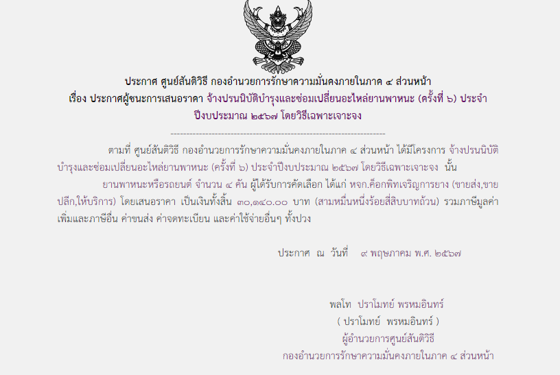 จัดซื้อ จัดจ้างประกาศผู้ชนะการเสนอราคา ประกาศผู้ชนะการเสนอราคา จ้างปรนนิบัติบำรุงและซ่อมเปลี่ยนอะไหล่ยานพาหนะ (ครั้งที่ ๖) ประจำ ปีงบประมาณ ๒๕๖๗ โดยวิธีเฉพาะเจาะจง May 13, 2024 349 Share Facebook Twitter Google+ Telegram LINE