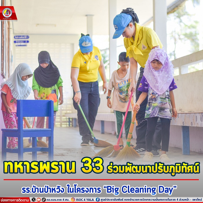 เมื่อวันที่ 13 พฤษภาคม 2567 หน่วยเฉพาะกิจกรมทหารพรานที่ 33 จัดกำลังพลจิตอาสาของหน่วย และกำลังพลชุดปฏิบัติการกิจการพลเรือน กองร้อยทหารพรานที่ 3309 ร่วมกับ ผู้นำหมู่บ้านหมู่บ้าน/ชุมชน, คณะครู, นักเรียน และประชาชนจิตอาสา จัดกิจกรรมจิตอาสาพัฒนา ในโครงการ “Big Cleaning Day” โดยร่วมกันทำความสะอาดอาคารเรียน, ทาสีห้องน้ำ/ห้องส้วม, พัฒนาปรับภูมิทัศน์บริเวณโดยรอบโรงเรียน และสนามกีฬา ซึ่งเป็นการปรับปรุงสิ่งแวดล้อมให้ปลอดโปร่ง โล่ง สะอาด ทั้งนี้เพื่อเป็นการเตรียมความพร้อมในการเปิดภาคเรียนที่ 1 ปีการศึกษา 2567 ณ โรงเรียนบ้านป่าหวัง หมู่ที่ 1 ตำบลบันนังสตา อำเภอบันนังสตา จังหวัดยะลา
