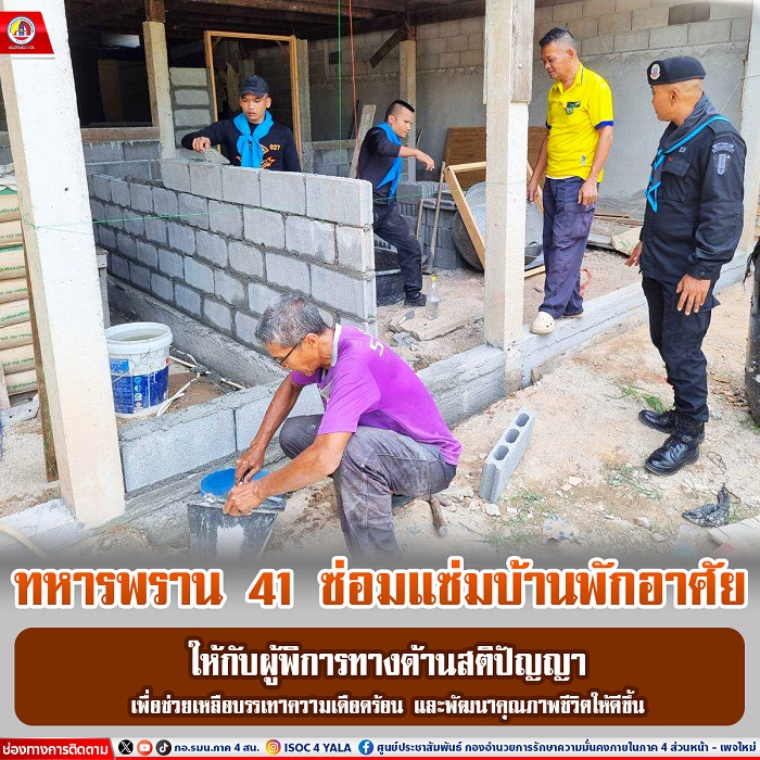 เมื่อวันที่ 13 พฤษภาคม 2567 เวลา 13.00 น. หน่วยเฉพาะกิจกรมทหารพรานที่ 41 โดย ผู้บังคับกองร้อยทหารพรานที่ 4103 จัดกำลังพล ชุดปฏิบัติการกิจการพลเรือน กองร้อยทหารพรานที่ 4103 ร่วมกับ ผู้นำชุมชน และประชาชนในพื้นที่ ดำเนินการสร้างบ้านพักอาศัย ให้กับ นางสาว นุหายาดี เซ๊ะกามิ ซึ่งเป็นเป็นผู้พิการทางด้านสติปัญญา (ประเภท 5) เพื่อเป็นการช่วยเหลือบรรเทาความเดือดร้อน และยังเป็นการยกระดับคุณภาพชีวิตให้ประชาชน ได้สามารถกลับมาใช้ชีวิตอย่างปกติสุขโดยเร็ว ในพื้นที่ อำเภอรามัน จังหวัดยะลา
