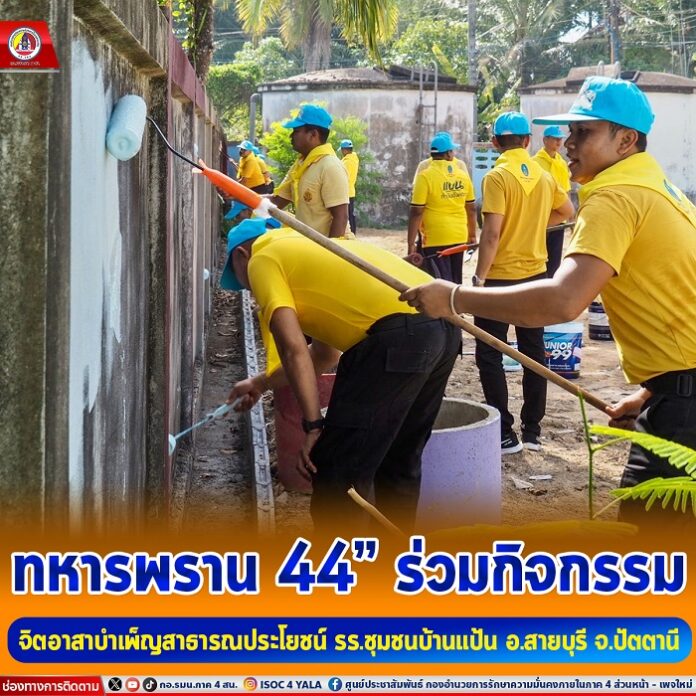 เมื่อวันที่ 13 พฤษภาคม 2567 หน่วยเฉพาะกิจกรมทหารพรานที่ 44 จัดกำลังพลของหน่วยในส่วนของจิตอาสาทหารพรานฯ ร่วมกับ บุคลากรทางการศึกษาฯ และพี่น้องประชาชนในพื้นที่ ตำบลแป้น อำเภอสายบุรี จังหวัดปัตตานี เข้าร่วมกิจกรรม “จิตอาสาบำเพ็ญสาธารณประโยชน์” ในการช่วยกันพัฒนา (ทาสี) เพื่อเป็นการปรับปรุงพื้นที่โดยรวมของสถานศึกษา ก่อนการเปิดภาคเรียน ในห้วงเดือน พฤษภาคม 2567