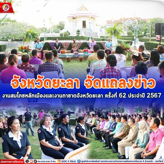 เมื่อวันที่ (14 พฤษภาคม 2567) เวลา 17.00 น. จังหวัดยะลา จัดแถลงข่าวงานสมโภชหลักเมืองและงานกาชาดจังหวัดยะลา ครั้งที่ 62 ประจำปี 2567 ณ บริเวณลานหน้าศาลหลักเมืองยะลา อำเภอเมืองยะลา จังหวัดยะลา โดยมี นายอำพล พงศ์สุวรรณ ผู้ว่าราชการจังหวัดยะลา เป็นประธานการแถลงข่าว โดยมีผู้ร่วมแถลงข่าวประกอบด้วย นางฉลวย พงค์สุวรรณ นายกเหล่ากาชาดจังหวัดยะลา กล่าวถึงภาพรวมของการจัดงานกาชาดจังหวัดยะลา ประจำปี 2567 การจัดการหารายได้เพื่อสมทบทุนงานกาชาดจังหวัดยะลา เพื่อไว้ช่วยเหลือประชาชนชาวยะลาในกรณีการช่วยเหลือเร่งด่วนและด้านอื่นๆ ท่านที่สอง พล.ต.ต. เสกสันต์ ชูรังสฤษฎิ์ ผู้บังคับการตำรวจภูธรจังหวัดยะลา ได้กล่าวถึงการดูแลรักษาความปลอดภัยและความสงบเรียบร้อยการจัดงานเพื่อสร้างความมั่นใจให้กับประชาชนในพื้นที่ในบริเวณการจัดงาน ท่านที่สาม พันเอก วิธเวช วิเศษศรี รองผู้บังคับหน่วยเฉพาะกิจยะลา กล่าวถึงประเด็นการดูแลรักษาความปลอดภัยและความสงบเรียบร้อยการจัดงาน เพื่อสร้างความมั่นใจให้กับประชาชน รอบๆ บริเวณการจัดงาน และท่านสุดท้าย นางสุนิสา อยู่หนูสิงห์ วัฒนธรรมจังหวัดยะลา พูดถึงประเด็นการสร้างความบันเทิง การแสดง ศิลปะวัฒนธรรมเวทีกลาง และกิจกรรมต่างๆ ที่สร้างสีสัน ความสุขสนุกสนานให้กับประชาชนที่มาเที่ยวชมงานสมโภชหลักเมืองและงานกาชาดจังหวัดยะลา ประจำปี 2567