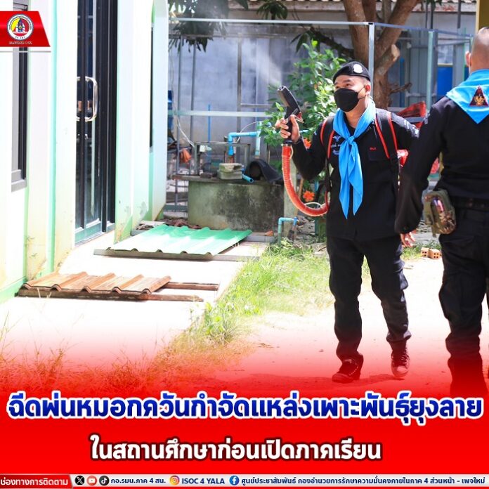 หน่วยเฉพาะกิจกรมทหารพรานที่ 22 โดย กองร้อยทหารพรานที่ 2208 จัดชุดปฏิบัติการพลเรือน ร่วมกับเจ้าหน้าที่สาธารณสุข, ผู้นำชุมชน และ เจ้าหน้าที่โรงพยาบาลส่งเสริมสุขภาพตำบลระแว้ง ลงพื้นที่พ่นหมอกควันกำจัดยุงลาย และกำจัดแหล่งเพาะพันธุ์ของลูกน้ำยุงลายให้กับสถานศึกษา เพื่อป้องกันโรคไข้เลือดออก, ชิคุนกุนยา และป้องกันพาหนะนำโรคชนิดต่างๆ เพื่อเป็นการเตรียมพื้นที่สถานศึกษาก่อนเปิดภาคเรียน ในห้วงเดือนพฤษภาคม 2567 บริเวณภายในสถานศึกษาในพื้นที่ ตำบลระแว้ง อำเภอยะรัง จังหวัดปัตตานี