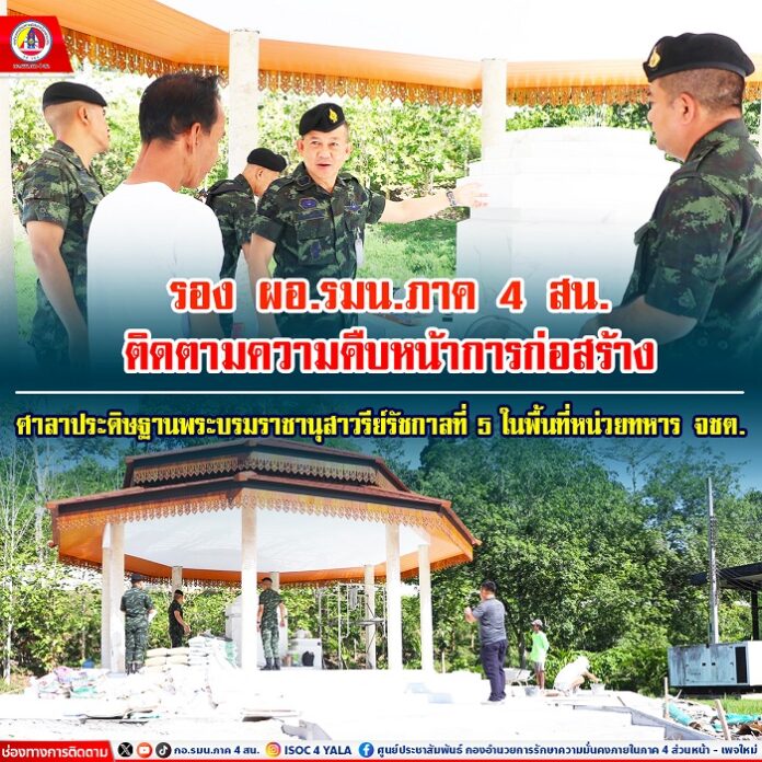 วันนี้ (16 พฤษภาคม 2567) เวลา 09.00 น. พลตรี เกรียงศักดิ์ วัฒนเกริก รองผู้อำนวยการรักษาความมั่นคงภายในภาค 4 ส่วนหน้า ลงพื้นที่ติดตามการดำเนินงานก่อสร้างศาลาวงกลมประดิษฐาน พระบรมราชานุสาวรีย์ พระบาทสมเด็จ พระปรมินทรมหาจุฬาลงกรณ์ พระจุลจอมเกล้าเจ้าอยู่หัว (รัชกาลที่ 5) ในพื้นที่ กองพันทหารราบที่ 1 กรมทหารราบที่ 152 ตำบลถ้ำทะลุ อำเภอบันนังสตา จังหวัดยะลา โดยมีผู้บังคับกองพันทหารราบที่ 1 กรมทหารราบที่ 152 และกำลังพลให้การต้อนรับ