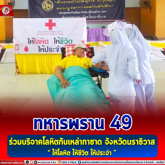 เมื่อวันที่ 16 พฤษภาคม 2567 เวลา 09.00 น. พันเอก ภาณุวัฒน์ สุคชเดช ผู้บังคับหน่วยเฉพาะกิจกรมทหารพรานที่ 49 มอบหมายให้ กองร้อยหน่วยขึ้นตรงหน่วยเฉพาะกิจกรมทหารพรานที่ 49 ในพื้นที่อำเภอจะแนะ จัดกำลังพลจิตอาสา จำนวน 33 นาย ร่วมบริจาคโลหิต ประจำเดือนพฤษภาคม 2567 ภายใต้ชื่อโครงการ “ให้โลหิต ให้ชีวิต ให้ประจำ (Give Blood, Give Lives, Give Forever)” โดยมีวัตถุประสงค์จัดหาโลหิตให้แก่โรงพยาบาลนราธิวาสราชนครินทร์และโรงพยาบาลสุไหงโก-ลก เพื่อให้มีปริมาณโลหิตที่เพียงพอในการช่วยเหลือผู้ป่วย รวมทั้งได้รับผลกระทบและบาดเจ็บจากเหตุการณ์ความไม่สงบในพื้นที่จังหวัดชายแดนภาคใต้ ณ หอประชุมที่ว่าการอำเภอจะแนะ จังหวัดนราธิวาส