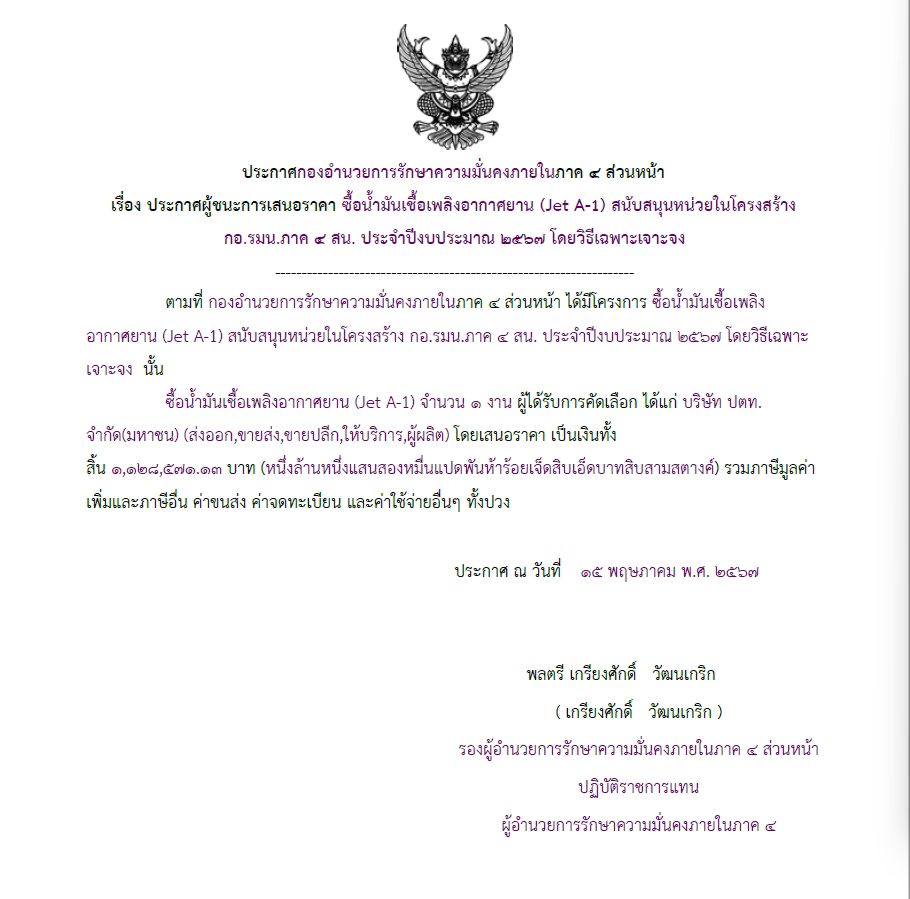 จัดซื้อ จัดจ้างประกาศผู้ชนะการเสนอราคา ประกาศผู้ชนะการเสนอราคา ซื้อน้ำมันเชื้อเพลิงอากาศยาน (Jet A-1) สนับสนุนหน่วยในโครงสร้าง กอ.รมน.ภาค 2 สน. ประจำปีงบประมาณ ๒๕๖๗ โดยวิธีเฉพาะเจาะจง May 17, 2024 505 Share Facebook Twitter Google+ Telegram LINE