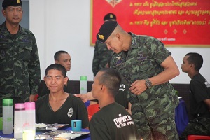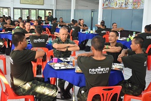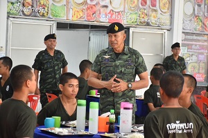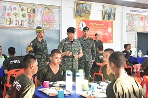 หลังจากนั้นได้ร่วมขัดฉาก การปฏิญาณตน ก่อนทานอาหาร และร่วมรับประทานอาหารมื้อเช้าร่วมกับน้องทหารใหม่ สอบถามความเป็นอยู่ ปัญหาข้อขัดข้อง สภาพจิตใจหลังจากเข้ามาเป็นทหารใหม่ พร้อมให้กำลังใจให้ผ่านการฝึกไปได้ด้วยดี ไม่ต้องเป็นห่วงทางบ้าน เพราะมีช่องทางติดตามข่าวสารแจ้งให้ทางบ้านทราบตลอดห้วงการฝึก ทำให้ทหารใหม่มีขวัญ และกำลังใจในการฝึกมากขึ้น โดยมี พันเอก ณรงค์ ตันติสิทธิพร รองผู้บัญชาการกองพลทหารราบที่ 15 พันโท ธีรศานต์ ตระกูลดี ผู้บังคับกองพันทหารราบที่ 3 กรมทหารราบที่ 153 และส่วนที่เกี่ยวข้องร่วมให้การต้อนรับ