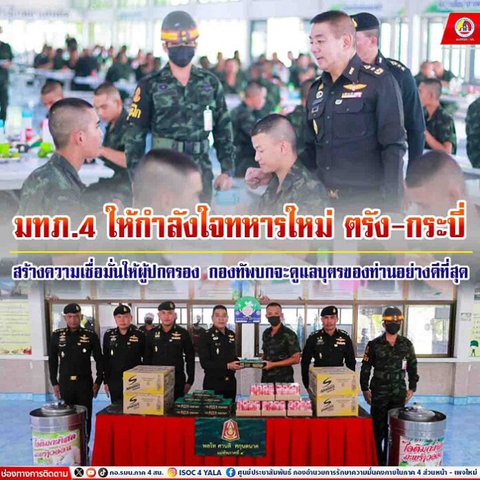 เมื่อวันที่ 17 พฤษภาคม 2567 เวลา 10.00 น. พลโท ศานติ ศกุนตนาค แม่ทัพภาคที่ 4 / ผู้อำนวยการรักษาความมั่นคงภายในภาค 4 ตรวจเยี่ยมให้กำลังใจ น้องทหารใหม่ ผลัดที่ 1 ประจำปี 2567 กองพันทหารราบที่ 1 กรมทหารราบที่ 15 อำเภอคลองท่อม จังหวัดกระบี่ และ กองพันทหารราบ 4 กรมทหารราบที่ 15 อำเภอห้วยยอด จังหวัดตรัง พร้อมกำชับหน่วยฝึก ผู้ฝึก ปฏิบัติตามนโยบายของผู้บัญชาการทหารบก ดูแลน้องเล็กคนสุดท้องอย่างดีที่สุด และต้องใส่ใจเหมือนครอบครัว นอกจากนี้ให้สนับสนุนการศึกษาต่อ ส่งเสริมการฝึกอาชีพเสริม และความก้าวหน้าในการบรรจุเข้ารับราชการทหาร ตลอดจนดูแลสิทธิ สวัสดิการของทหารกองประจำการอย่างครบถ้วน สร้างความเชื่อมั่นให้ผู้ปกครองและญาติมั่นใจว่า กองทัพบกจะดูแลบุตรของท่านอย่างดีที่สุด