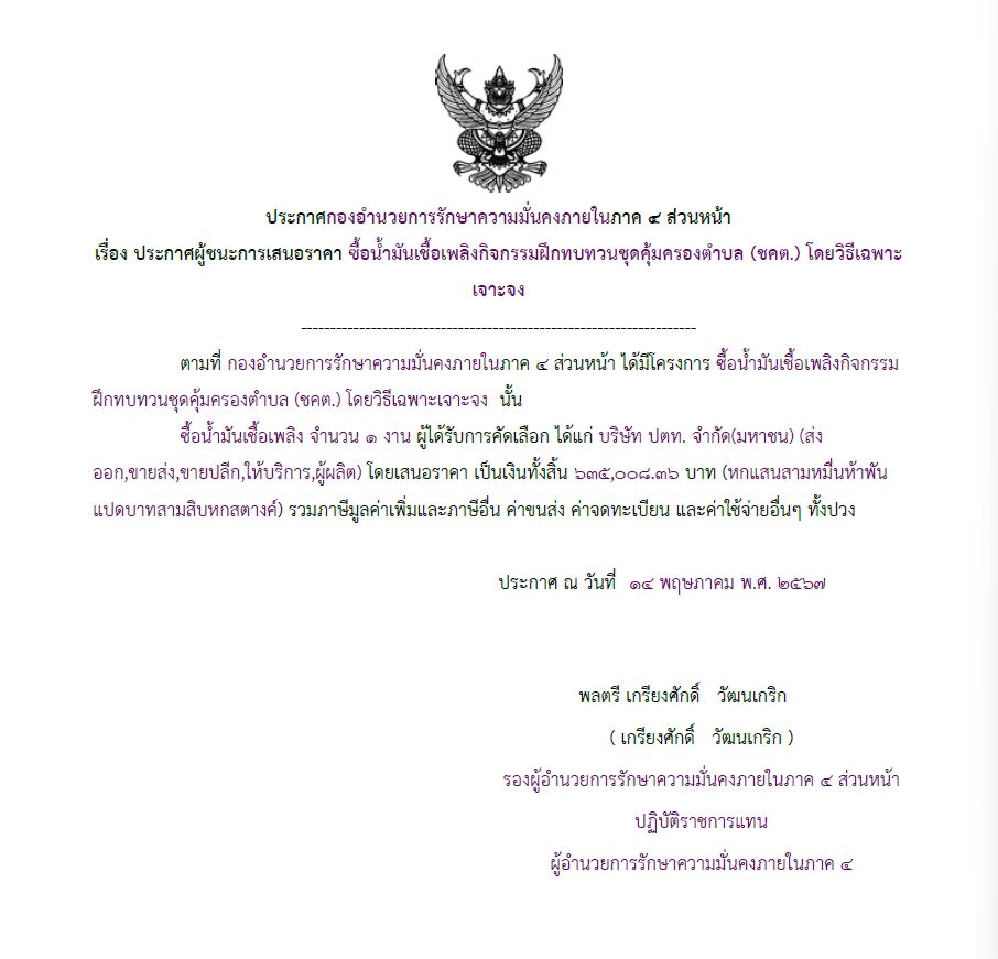 ประกาศผู้ชนะการเสนอราคา ซื้อน้ำมันเชื้อเพลิงกิจกรรมฝึกทบทวนชุดคุ้มครองตำบล (ชคต.) โดยวิธีเฉพาะ เจาะจง