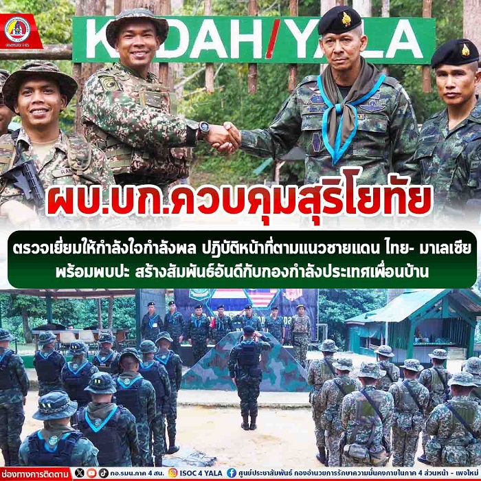 เมื่อวันที่ 18 พฤษภาคม 2567 เวลา 0900 น. ที่ฐานปฏิบัติการชุดป้องกันชายแดน กองร้อยป้องกันชายแดนที่ 1 ตำบลธารน้ำทิพย์ อำเภอเบตง จังหวัดยะลา พลตรี เฉลิมพร ขำเขียว ผู้บัญชาการกองพลทหารราบที่ 15/ผู้บังคับกองบังคับการควบคุมสุริโยทัย เดินทางมาตรวจเยี่ยม ติดตามผลการปฏิบัติงานของกองร้อยป้องกันชายแดนที่ 1 ซึ่งปฏิบัติหน้าที่รักษาความมั่นคงตามแนวชายแดนไทย-มาเลเซีย โดยได้เน้นย้ำกำชับการวางกำลังป้องกันชายแดน เพิ่มมาตรการควบคุมพื้นที่ตามช่องทางข้ามธรรมชาติ การปฏิบัติงานร่วมกันกับทุกภาคส่วนในการบังคับใช้กฎหมายตามแนวชายแดน ไทย-มาเลเซีย อย่างเข้มงวด พร้อมทั้งสั่งการชุดปฏิบัติการจรยุทธ์ ทำการลาดตระเวนพิสูจน์ทราบ และซุ่มเฝ้าตรวจ ตามแผนเชิงรุกในรูปแบบการลาดตระเวนเพื่อควบคุมพื้นที่ในเขตพื้นที่รับผิดชอบหมู่บ้าน Support site รวมไปถึงพื้นที่ จุดเสี่ยง/จุดล่อแหลมต่าง ๆ เพื่อเป็นการจำกัดเสรีความพยายามในการปฏิบัติของฝ่ายตรงข้าม ที่อาจจะลักลอบเข้ามาก่อเหตุสร้างสถานการณ์ได้ และเพื่อเป็นการรักษาความปลอดภัยให้กับพี่น้องประชาชนในพื้นที่