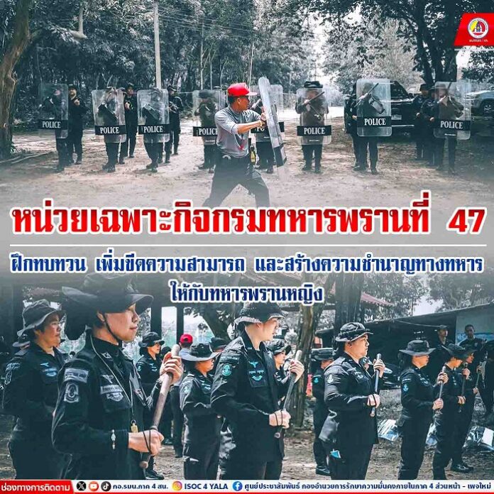 เมื่อวันที่ 19 พฤษภาคม 2567 ที่ ฐานปฏิบัติการ กองร้อยทหารพรานที่ 4707 อำเภอยะหา จังหวัดยะลา หน่วยเฉพาะกิจกรมทหารพรานที่ 47 ดำเนินการฝึกทบทวนความรู้ให้กับกำลังพล หมวดทหารพรานหญิง 47 เกี่ยวกับการควบคุมฝูงชน โดยใช้ โล่-กระบอง เพื่อเป็นการเพิ่มพูนความรู้ สร้างความเข้าใจ เพิ่มขีดความสามารถ และสร้างความชำนาญทางทหาร ให้กับทหารพรานหญิง รวมทั้งสามารถนำไปปฏิบัติได้อย่างถูกต้อง และปลอดภัย ทั้งในรูปแบบการฝึก และการปฏิบัติงานจริง นำไปสู่การแก้ปัญหาในพื้นที่ได้อย่างมีประสิทธิภาพต่อไป