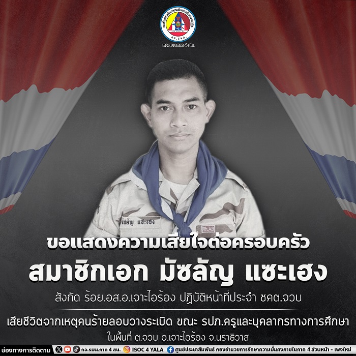 เสียชีวิตจากเหตุคนร้ายลอบวางระเบิด ขณะ รปภ.ครู และบุคลากรทางการศึกษา ในพื้นที่ ต.จวบ อ.เจาะไอร้อง จ.นราธิวาส