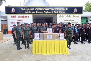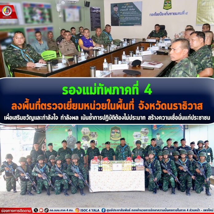 โอกาสนี้ รองแม่ทัพภาคที่ 4 / รองผู้อำนวยการรักษาความมั่นคงภายในภาค 4 ส่วนหน้า ได้นำความห่วงใยจากแม่ทัพภาคที่ 4 / ผู้อำนวยการรักษาความมั่นคงภายในภาค 4 และข้อสั่งการถึงนโยบายการแก้ไขปัญหายาเสพติด, ภารกิจการช่วยเหลือประชาชนที่ได้รับความเดือดร้อน ด้วยการบูรณาการกับทุกภาคส่วน เพื่อบรรเทาความเดือดของพี่น้องประชาชนอย่างเร่งด่วน พร้อมกำชับปฏิบัติงานด้วยความไม่ประมาท หมั่นสอดส่องดูแลจุดเสี่ยงเพิ่มความเข้มงวดจุดล่อแหลมต่าง ๆ ระมัดระวังการก่อเหตุรุนแรงในพื้นที่ พร้อมทั้งได้มอบสิ่งของอุปโภคบริโภคเพื่อเป็นขวัญและกำลังใจในการปฏิบัติงานของเจ้าหน้าที่ต่อไป