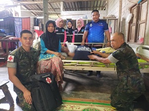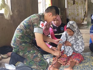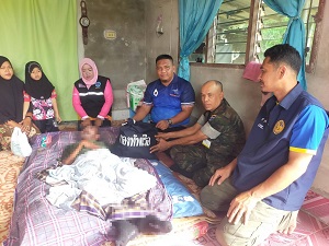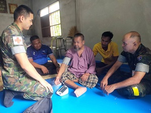 ขณะเดียวกัน หน่วยเฉพาะกิจนาวิกโยธิน กองทัพเรือ 33 จัดชุดปฏิบัติการกิจการพลเรือนพร้อมด้วยเจ้าหน้าที่พยาบาล ร่วมกับ ผู้ใหญ่บ้านพร้อมทีมงาน อสม.ประจำหมู่บ้าน พบปะเยี่ยมเยียน ตรวจรักษาพยาบาลเบื้องต้น แนะนำวิธีการดูแลรักษาสุขภาพ และจ่ายยาให้กับประชาชนในพื้นที่บ้านลูโบ๊ะซามา หมูที่ 8 ตำบลปาเสมัส อำเภอสุไหงโก-ลก จังหวัดนราธิวาส ตามโครงการ หมอเดินเท้าเข้าทุกชุมชน พร้อมทั้งยังได้มอบถุงยังชีพกองทัพเรือให้กับผู้ป่วยติดเตียง จำนวน 7 ราย เพื่อบรรเทาความเดือดร้อนและได้ให้กำลังใจกับประชาชน