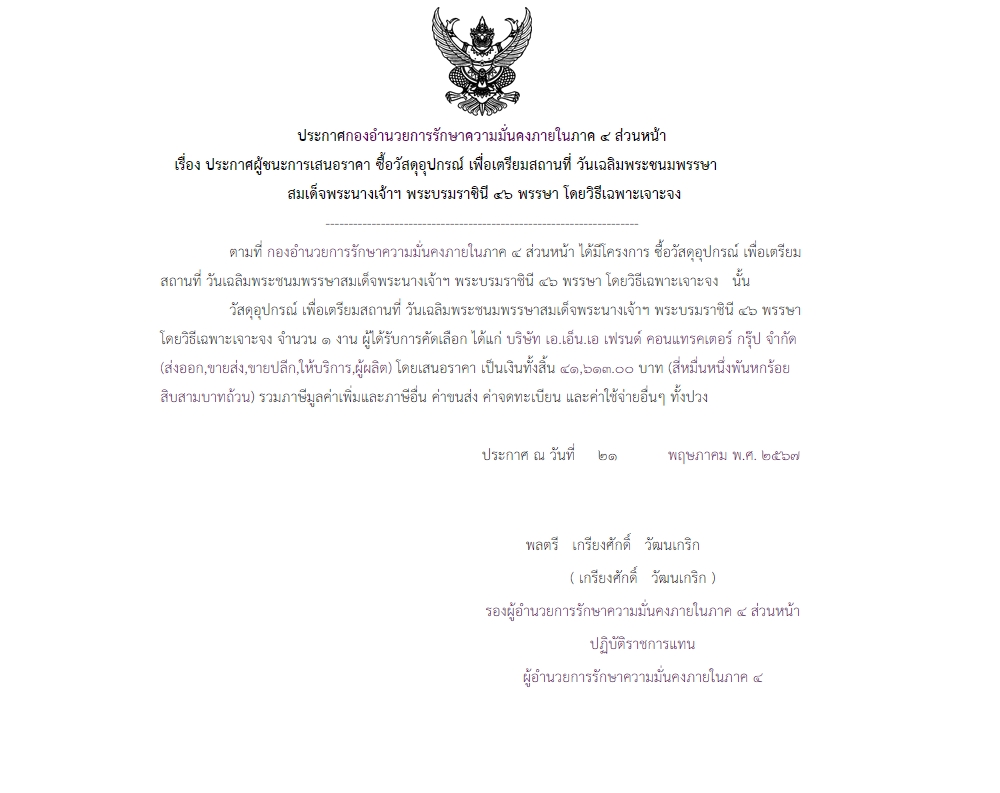จัดซื้อ จัดจ้างประกาศผู้ชนะการเสนอราคา ประกาศผู้ชนะการเสนอราคา ซื้อวัสดุอุปกรณ์ เพื่อเตรียมสถานที่ วันเฉลิมพระชนมพรรษา สมเด็จพระนางเจ้าฯ พระบรมราชินี ๔’๖ พรรษา โดยวิธีเฉพาะเจาะจง May 23, 2024 348 Share Facebook Twitter Google+ Telegram LINE