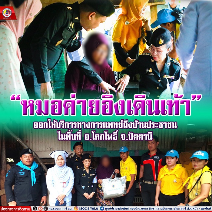 โรงพยาบาลค่ายอิงคยุทธบริหาร นำชุดแพทย์เคลื่อนที่ ออกให้บริการทางการแพทย์แก่พี่น้องประชาชนในพื้นที่บ้านสลาม ตำบลนาประดู่ อำเภอโคกโพธิ์ จังหวัดปัตตานี ตามโครงการ “หมอค่ายอิงเดินเท้า” โดยได้ร่วมกับ หน่วยเฉพาะกิจสันติสุข, ชุดควบคุมที่ 951, กองร้อยทหารพรานที่ 4301, ผู้นำชุมชน, อาสาธารณสุขประจำหมู่บ้าน (อสม.) และ ผู้นำหมู่บ้าน ดำเนินการเข้าเยี่ยมผู้ป่วย จำนวน 6 ราย ซึ่งเป็นผู้สูงอายุและผู้ป่วยติดเตียงที่เดินทางไปยังโรงพยาบาลได้ยากลำบาก และต้องการรับบริการทางการแพทย์ เพื่อเป็นการบรรเทาความเดือดร้อน ลดค่าใช่จ่ายและภาระในการเดินทางไปพบแพทย์