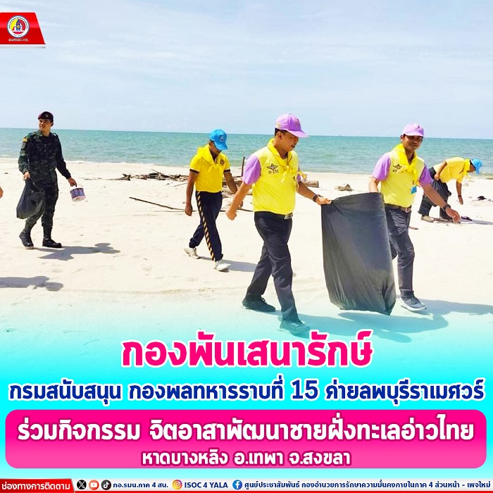 วันที่ 28 พฤษภาคม 2567 เวลา 13.30 น. พันโท ธนรัฐ ลำจวน ผู้บังคับกองพันเสนารักษ์กรมสนับสนุน กองพลทหารราบที่ 15 ค่ายลพบุรีราเมศวร์ นำกำลังพลจิตอาสา และสมาชิกสมาคมแม่บ้านทหารบกของหน่วย ร่วมกับ ส่วนราชการอำเภอเทพา และประชาชนในพื้นที่ ร่วมกิจกรรมจิตอาสาพัฒนาชายฝั่งทะเล “การอนุรักษ์ระบบนิเวศ และสิ่งแวดล้อม” ณ หาดบางหลิง หมู่ที่ 4 ตำบลปากบาง อำเภอเทพา จังหวัดสงขลา เพื่อถวายเป็นพระราชกุศล เนื่องในวันที่ระลึกพระบาทสมเด็จพระปกเกล้าเจ้าอยู่หัว รัชกาลที่ 7 (30 พฤษภาคม 2567) อีกทั้งเป็นการแสดงออกถึงความจงรักภักดีและสำนึกในพระมหากรุณาธิคุณที่ทรงมีต่อประเทศชาติและปวงชนชาวไทย รวมถึงแสดงถึงความสามัคคีของทุกภาคส่วนในการทำกิจกรรมสาธารณประโยชน์โดยร่วมกันเก็บขยะริมชายหาด และปรับปรุงภูมิทัศน์แหล่งท่องเที่ยวให้มีความสวยงาม สะอาด และมีระบบนิเวศที่ดีขึ้น