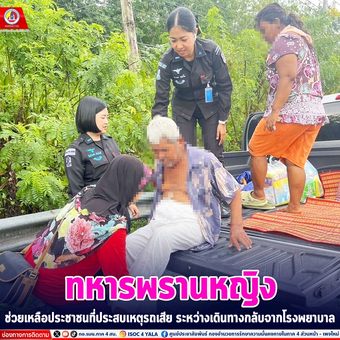 เมื่อวันที่ 30 พฤษภาคม 2567 เวลา 17.00 น. ขณะที่เจ้าหน้าที่ทหารพรานหญิงจาก กองกำลังทหารพรานจังหวัดชายแดนภาคใต้ กำลังเดินทางกลับจากการปฏิบัติราชการในพื้นที่ ได้พบเห็นประชาชนขับขี่รถจักรยานยนต์พ่วงข้างโบกมือเรียกขอความช่วยเหลืออยู่ข้างทาง โดยเจ้าหน้าที่ได้สังเกตุเห็นว่าบนรถจักรยานยนต์พ่วงข้างมีผู้โดยสารเป็นผู้หญิง และมีผู้ป่วยติดเตียงอยู่ด้วย ประกอบกับสภาพอากาศขณะนั้นมีฝนตกโปรยปรายเล็กน้อย จึงได้ตัดสินใจจอดรถและลงไปสอบถาม ทำให้ทราบว่าประชาชนดังกล่าวประสบเหตุรถเสียระหว่างทางในขณะกำลังเดินทางกลับจากโรงพยาบาลเพื่อจะเดินทางกลับบ้านพัก จึงได้โบกมือขอความช่วยเหลือจากผู้ที่สัญจรผ่านไปมา