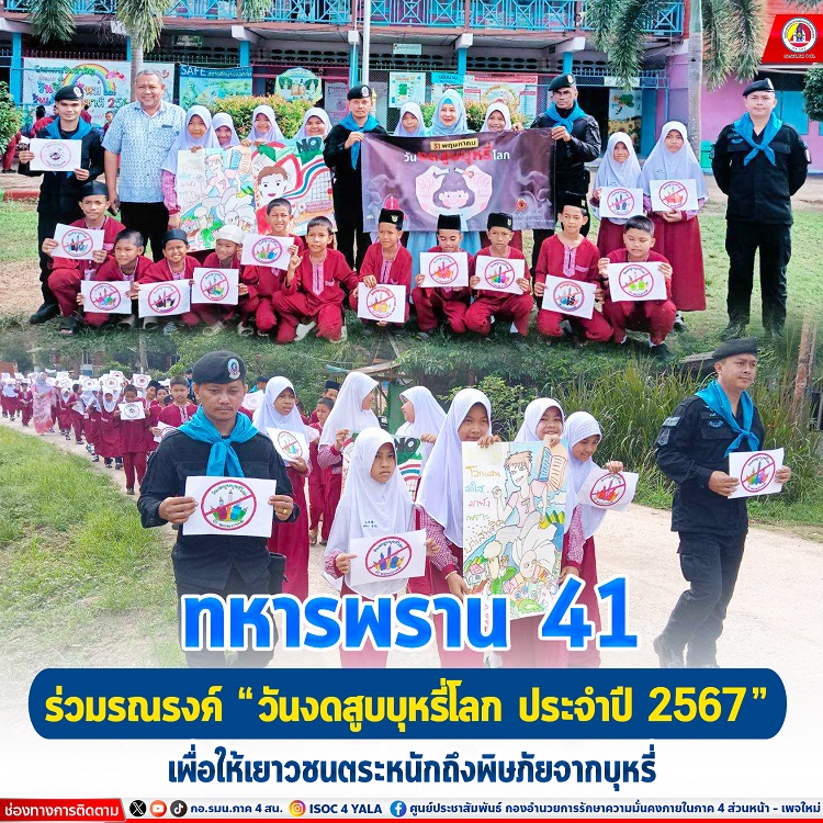 เมื่อวันที่ 31 พฤษภาคม 2567 หน่วยเฉพาะกิจกรมทการพรานที่ 41 จัดกำลังพล กองร้อยทหารพรานหน่วยขึ้นตรง ร่วมกับ ตำรวจภูธร, ชุดคุ้มครองตำบล (ชคต.), ผู้นำชุมชน, คณะครู/นักเรียน และประชาชนในพื้นที่ ร่วมกิจกรรมเดินรณรงค์ “วันงดสูบบุหรี่โลก ประจำปี 2567″ เพื่อให้เยาวชนได้ตระหนักถึงพิษภัยของบุหรี่ ป้องกันนักสูบหน้าใหม่ ตลอดจนการเพิ่มพื้นที่ปลอดบุหรี่ของจังหวัดชายแดนภาคใต้ ณ สถานศึกษาในพื้นที่ อำเภอรามัน และอำเภอบันนังสตา จังหวัดยะลา