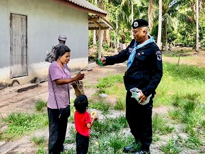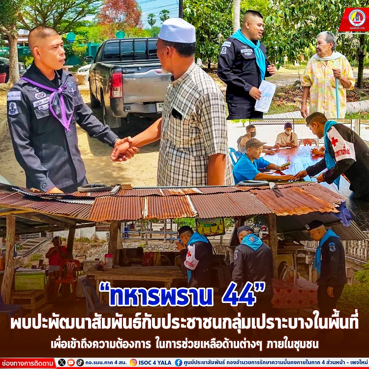 เมื่อวันที่ 31 พฤษภาคม 2567 หน่วยเฉพาะกิจกรมทหารพรานที่ 44 จัดกำลังพลชุดปฏิบัติการเสริมสร้างความเข้าใจ เข้าพบปะพูดคุยพัฒนาสัมพันธ์ กับพี่น้องประชาชนชาวไทยพุทธ/ชาวไทยมุสลิม รวมทั้งให้กำลังใจพี่น้องประชาชนกลุ่มเปราะบางในพื้นที่ เพื่อสอบถามความเป็นอยู่ในการดำเนินชีวิต และความต้องการในการช่วยเหลือด้านต่างๆ และร่วมกันหาแนวทางในการช่วยเหลือในโอกาสต่อไป ตลอดจนได้แลกเปลี่ยนข้อมูลข่าวสารต่างๆ ภายในชุมชน