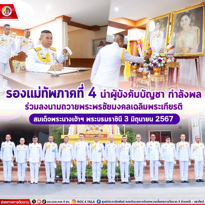 วันที่ 3 มิถุนายน 2567 เวลา 09.00 น. ที่กองอำนวยการรักษาความมั่นคงภายในภาค 4 ส่วนหน้า ค่ายสิรินธร ตำบลเขาตูม อำเภอยะรัง จังหวัดปัตตานี พลตรี ไพศาล หนูสังข์ รองแม่ทัพภาคที่ 4/ รองผู้อำนวยการรักษาความมั่นคงภายในภาค 4 ส่วนหน้า เป็นประธานนำคณะผู้บังคับบัญชา กำลังพล ร่วมพิธีลงนามถวายพระพรชัยมงคลเฉลิมพระเกียรติ เนื่องในโอกาสวันเฉลิมพระชนมพรรษา สมเด็จพระนางเจ้าสุทิดา พัชรสุธาพิมลลักษณ พระบรมราชินี 46 พรรษา 3 มิถุนายน 2567 เพื่อสำนึกในพระมหากรุณาธิคุณ ที่พระองค์ ทรงแบ่งเบาพระราชภาระ พระบาทสมเด็จพระเจ้าอยู่หัว และทรงเป็นแบบอย่างแก่ทหาร ในความเข้มแข็ง มีระเบียบวินัยและสง่างาม