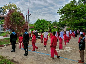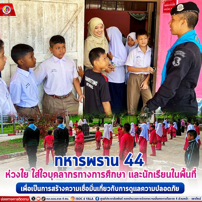 เมื่อวันที่ 4 มิถุนายน 2567 หน่วยเฉพาะกิจกรมทหารพรานที่ 44 จัดกำลังพลของหน่วยในส่วนของ “ชุดปฏิบัติการเสริมสร้างความเข้าใจ” เข้าพบปะพูดคุยพัฒนาสัมพันธ์ กับบุคลากรทางการศึกษาในพื้นที่รับผิดชอบ และได้แสดงการเคารพธงชาติ ร่วมกับบุคลากรทางการศึกษา ภายใต้ “โครงการกิจกรรมเสาธง 5 นาที” เพื่อเป็นการสร้างค่านิยมให้เยาวชน/นักเรียน เกี่ยวกับอุดมการณ์ในการ “รักชาติ ศาสนา และพระมหากษัตริย์”