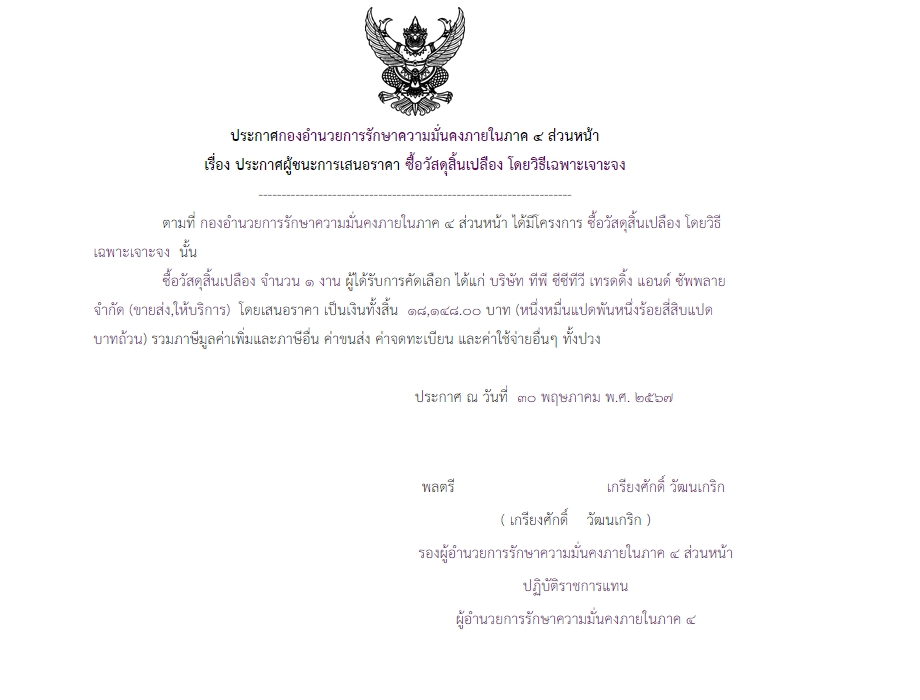ประกาศผู้ชนะการเสนอราคา ซื้อวัสดุสิ้นเปลือง โดยวิธีเฉพาะเจาะจง
