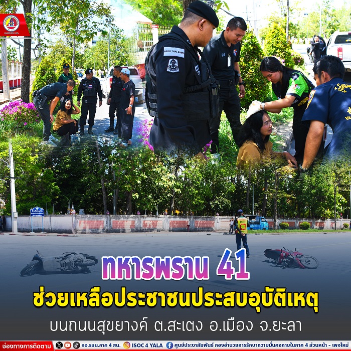 เมื่อวันที่ 5 มิถุนายน 2567 เวลา 10.40 น. กำลังพลหน่วยเฉพาะกิจกรมทหารพรานที่ 41 เร่งให้การช่วยเหลือประชาชนที่ประสบอุบัติเหตุบนท้องถนนบริเวณถนนสายสุขยางค์ ตำบลสะเตง อำเภอเมือง จังหวัดยะลา อย่างเร่งด่วน ขณะเดินทางกลับจากปฏิบัติหน้าที่ในพื้นที่ ตำบลลำใหม่ อำเภอเมือง จังหวัดยะลา ขณะนั้นได้มีชาวบ้านประสบอุบัติเหตุบนถนน จึงได้รีบเข้าให้การช่วยเหลือ ปฐมพยาบาลเบื้องต้นให้กับผู้บาดเจ็บ และสอบถามอาการบาดเจ็บต่าง ๆ พร้อมกับประสานหน่วยงานและรถพยาบาลก่อนนำผู้ได้รับบาดเจ็บส่งโรงพยาบาลศูนย์ยะลาเพื่อเข้ารับการรักษาต่อไป
