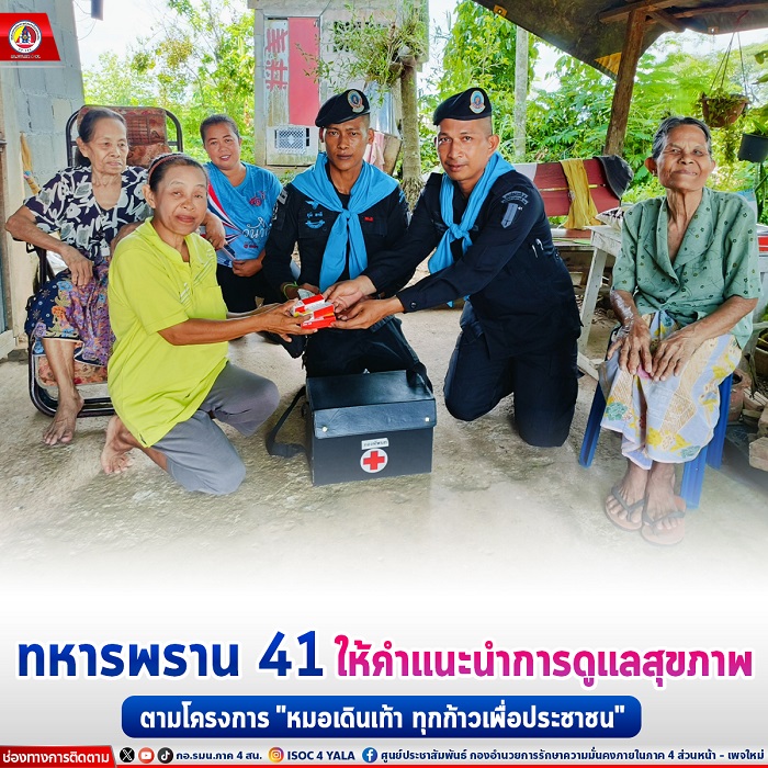เมื่อวันที่ 5 มิถุนายน 2567 เวลา 14.00 น. หน่วยเฉพาะกิจกรมทหารพรานที่ 41 จัดกำลังพลชุดหมอเดินเท้า กองร้อยทหารพรานที่ 4104 ลงพื้นที่พบปะเยี่ยมเยียนให้คำแนะนำการดูแลสุขภาพแก่ประชาชนผู้สูงอายุในพื้นที่ ตามโครงการ “หมอเดินเท้า ทุกก้าว เพื่อประชาชน” ณ บ้านเลขที่ 67 ถนนจรูญวิถี บ้านรามัน หมู่ที่ 1 ตำบลกายูบอเกาะ อำเภอรามัน จังหวัดยะลา