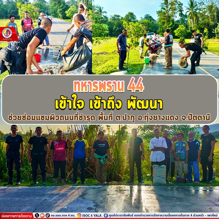 เมื่อวันที่ 6 มิถุนายน 2567 หน่วยเฉพาะกิจกรมทหารพรานที่ 44 จัดกำลังพลของหน่วย ร่วมกับ พี่น้องประชาชนในพื้นที่ตำบลปากู อำเภอทุ่งยางแดง จังหวัดปัตตานี ช่วยกันซ่อมแซมหลุมบนพื้นผิวถนนที่ชำรุด เพื่อเป็นการป้องกันการแสวงประโยชน์ของกลุ่มผู้ก่อเหตุรุนแรงในพื้นที่ และเป็นการลดอุบัติจากพื้นผิวถนนที่ชำรุด ให้กับพี่น้องประชาชนในการสัญจรบนท้องถนน