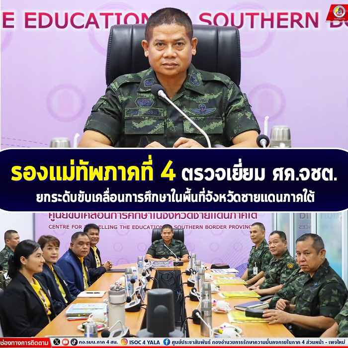 โอกาสนี้ พลตรี ไพศาล หนูสังข์ รองแม่ทัพภาคที่ 4 / รองผู้อำนวยการรักษาความมั่นคงภายในภาค 4 ส่วนหน้าได้ร่วมพูดคุยกับนายนิกร เซ้งเถียร ผู้อำนวยการศูนย์ขับเคลื่อนการศึกษาในจังหวัดชายแดนภาคใต้ เพื่อหารือแนวทางยกระดับการขับเคลื่อนการศึกษาในพื้นที่ให้มีความเข้มข้นทั้งมาตรฐานวิชาการควบคู่กับการแสดงออกทางอัตลักษณ์ในจังหวัดชายแดนภาคใต้ รวมไปถึงการแลกเปลี่ยนความคิดเห็นเกี่ยวกับสถานการณ์การศึกษา ตลอดจนปัญหา อุปสรรค และแนวทางการแก้ไขดังกล่าว เพื่อสร้างเมล็ดพันธุ์ทางการศึกษาในจังหวัดชายแดนใต้ให้มีคุณภาพ อีกทั้งเป็นกำลังสำคัญในการขับเคลื่อนสังคมในมิติที่สร้างสรรค์ต่อไป