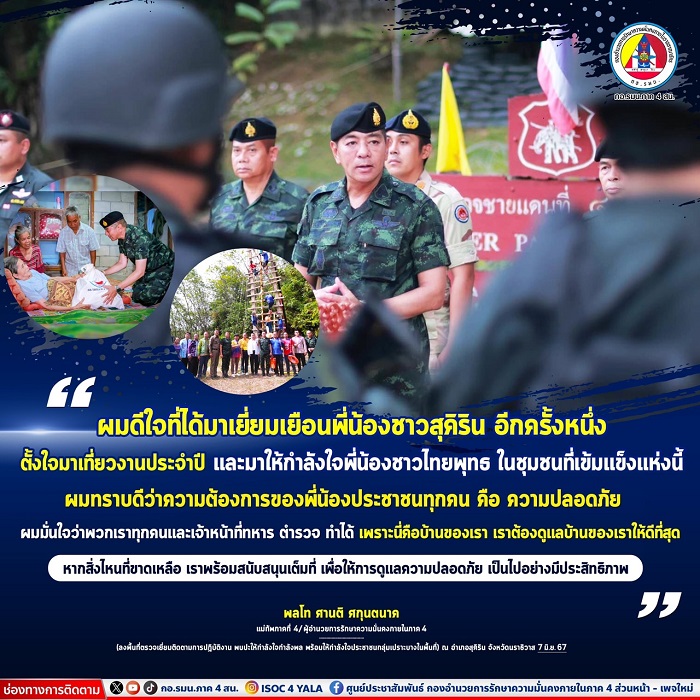 ผมมั่นใจว่าพวกเราทุกคนและเจ้าหน้าที่ทหาร ตำรวจ ทำได้ เพราะนี่คือบ้านของเรา เราต้องดูแลบ้านของเราให้ดีที่สุด หากสิ่งไหนที่ขาดเหลือ เราพร้อมสนับสนุนเต็มที่ เพื่อให้การดูแลความปลอดภัย เป็นไปอย่างมีประสิทธิภาพ” …………………………………. พลโท ศานติ ศกุนตนาค