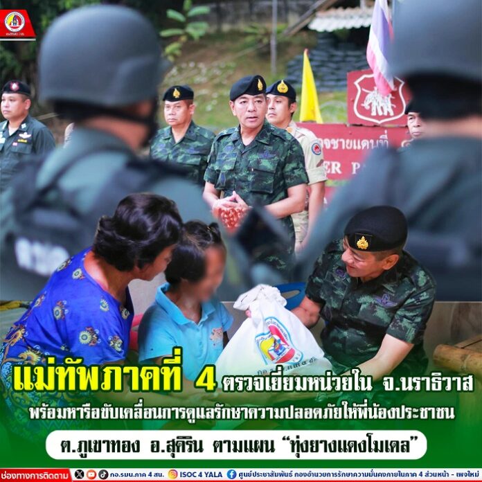 วันที่ 7 มิถุนายน 2567 เวลา 13.40 น. พลโท ศานติ ศกุนตนาค แม่ทัพภาคที่ 4/ ผู้อำนวยการรักษาความมั่นคงภายในภาค 4 พร้อมด้วย พลตรี ไพศาล หนูสังข์ รองแม่ทัพภาคที่ 4/ รองผู้อำนวยการรักษาความมั่นคงภายในภาค 4 ส่วนหน้า และคณะ ลงพื้นที่ตรวจเยี่ยมติดตามการปฏิบัติงาน พบปะให้กำลังใจกำลังพล ณ ฐานปฏิบัติการ ชุดคุ้มครองตำบลเกียร์ หมู่ที่ 2 บ้านไอยามู และกองร้อยทหารพรานที่ 1102 หมู่ที่ 3 บ้านน้ำใส ตำบลเกียร์ อำเภอสุคิริน จังหวัดนราธิวาส โดยมี พลตรี เฉลิมพร ขำเขียว ผู้บังคับหน่วยเฉพาะกิจนราธิวาส ผู้บังคับหน่วยในพื้นที่ ร่วมให้การต้อนรับ และติดตามคณะ พร้อมรับฟังสรุปผลการปฏิบัติงาน หารือปัญหาข้อขัดข้องในห้วงที่ผ่านมา โดยมี ปลัดตำบลเกียร์, กำนัน, ผู้ใหญ่บ้านในพื้นที่, หัวหน้าชุดคุ้มครองตำบลเกียร์ และกำลังพล ร่วมให้การต้อนรับ และเข้าร่วมประชุม พร้อมมอบเครื่องอุปโภคบริโภคเป็นขวัญกำลังใจ