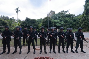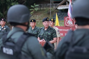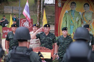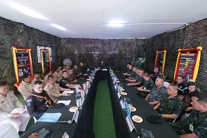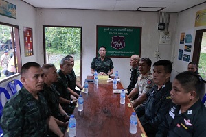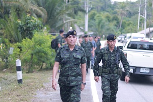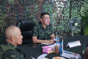 จากนั้น เดินทางไปที่ ศูนย์เรียนรู้ภูมิปัญญาทอผ้าบ้านโต๊ะโม๊ะ หมู่ที่ 3 ตำบลภูเขาทอง อำเภอสุคิริน จังหวัดนราธิวาส ประชุมหารือร่วมกับหน่วยงานในพื้นที่ ขับเคลื่อนงานด้านการดูแลรักษาความปลอดภัยตำบลภูเขาทอง โดยนำแผน “ทุ่งยางแดงโมเดล” มาเป็นแนวทางปฏิบัติงาน นำนโยบาย 5 งานสำคัญ มาใช้ขับเคลื่อนงานในระดับพื้นที่ โดยบูรณาการกำลังทุกภาคส่วน ทั้งทหาร ตำรวจ ฝ่ายปกครอง กองกำลังประจำถิ่น และภาคประชาชน ในการช่วยกันดูแลรักษาความปลอดภัยและความสงบเรียบร้อยในพื้นที่บ้านของตนเอง