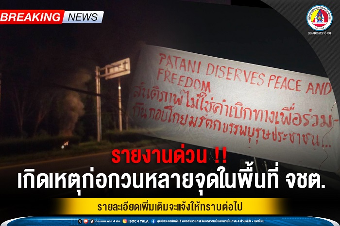 เมื่อวันที่ 8 มิถุนายน 2567 เวลา 21.40 น. เป็นต้นไป เกิดเหตุคนร้ายก่อกวนหลายจุดในพื้นที่จังหวัดชายแดนภาคใต้ หวังทำลายระบบเศรษฐกิจ สาธารณูปโภค สร้างความเดือดร้อนให้กับพี่น้องประชาชน ลดความเชื่อมั่นของเจ้าหน้าที่รัฐ ประกอบด้วย เหตุเผายางรถยนต์, พ่นสีสเปรย์บริเวณเกาะกลางถนน และแขวนป้ายผ้า ล่าสุดเจ้าหน้าที่ได้เข้าทำการควบคุมพื้นที่เกิดเหตุ อยู่ระหว่างรอการตรวจสอบวัตถุพยานและรวบรวมหลักฐานต่างๆ โดยละเอียดเพื่อตรวจสอบหาความเชื่อมโยงของกลุ่มคนร้ายมาดำเนินคดีตามกฎหมาย สำหรับความคืบหน้าจะรายงานให้ทราบต่อไป