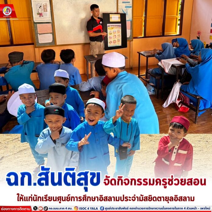 หน่วยเฉพาะกิจสันติสุข โดย ชุดสันติสุขที่ ๑๐๖ ดำเนินการจัดกิจกรรมครูช่วยสอนในหัวข้อเรื่องหน้าที่เด็กดี ๑๐ อย่าง ให้กับนักเรียนชั้นประถมศึกษาปีที่ ๑ – ๖ เพื่อเสริมสร้างภูมิคุ้มกัน ปลูกฝังแนวความคิดในเรื่องการสร้างภูมิคุ้มกันทางความคิด ปฏิเสธความรุนแรง พร้อมเสริมสร้าง สังคมแห่งการให้อภัย และการอยู่รวมกันภายใต้สังคมพหุวัฒนธรรมที่เข้มแข็ง พร้อมทั้งเชิญชวนร่วมแสดงสัญลักษณ์ WE ARE THAI”เราคือไทย”ปลูกจิตสำนึกความเป็นไทย สร้างความภาคภูมิใจในความเป็นชาติไทย ณ ศูนย์การศึกษาอิสลามประจำมัสยิดตายุลอิสลาม บ้านกะลูบี หมู่ที่ ๑๑ ตำบลเตราะบอน อำเภอสายบุรี จังหวัดปัตตานี