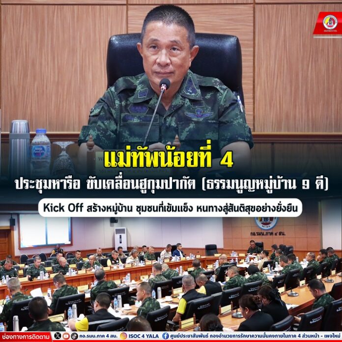 เมื่อวันที่ 10 มิถุนายน 2567 เวลา 13.30 น. ที่ห้องประชุม 1 กองอำนวยการรักษาความมั่นคงภายในภาค 4 ส่วนหน้า ค่ายสิรินธร ตำบลเขาตูม อำเภอยะรัง จังหวัดปัตตานี พลโท ปราโมทย์ พรหมอินทร์ แม่ทัพน้อยที่ 4/ รองผู้อำนวยการรักษาความมั่นคงภายในภาค 4 ส่วนหน้า เป็นประธานการประชุมคณะทำงาน ฮูกุมปากัต (ธรรมนูญหมู่บ้าน 9 ดี) โดยมี นายเสรี ศรีหะไตร ที่ปรึกษากองอำนวยการรักษาความมั่นคงภายในภาค 4 ส่วนหน้า, ผู้บังคับบัญชากองอำนวยการรักษาความมั่นคงภายในภาค 4 ส่วนหน้า, ผู้แทนศูนย์อำนวยการบริหารจังหวัดชายแดนภาคใต้, กองกำลังตำรวจจังหวัดชายแดนใต้, ผู้อำนวยการรักษาความมั่นคงภายในจังหวัด, ฝ่ายปกครอง และยังมีศูนย์ปฏิบัติการอำเภอใน 3 จังหวัด ปัตตานี ยะลา นราธิวาส และ 4 อำเภอของจังหวัดสงขลาเข้าร่วมประชุมทางไกล ผ่านระบบวิดีโอคอนเฟอเรนซ์